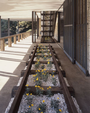 そして、親友のメナシェ・カディシュマンとみごとなコラボレーションを鎌倉館本館のテラスとそれに面する平家池を使って展開することになった。《カディッシュ― ツァバールのためのレクイエム》。坂倉準三設計の鎌倉館のなかでももっとも魅力的なテラスにカラヴァンは鉄路を敷設し、黄色い花の鉢をいくつもそこに配置し、さらに階段下には鏡を貼って、まるで「ヤコブの階梯」のように鉄路の反射像が垂直に上昇してゆくように設置してみせた。そして、池のなかにはイスラエルでは広く知られている南アメリカ産のサボテン「ツァバール」を立体物としてひとつ建てた。そして、その周囲にカディシュマンは、無数の死者の顔を暗示する、黄色く塗装した木製のレリーフを浮かべたのである。